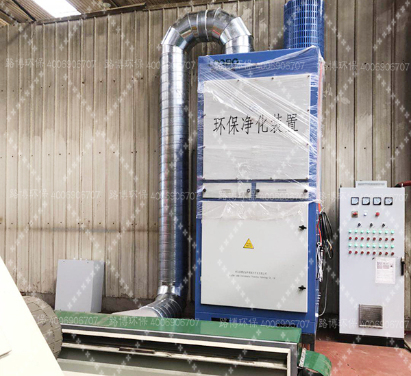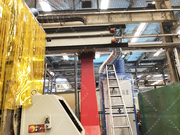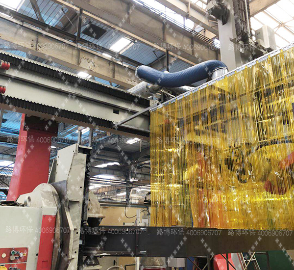 本項目用于山推焊接車間內(nèi)焊接機器人工位焊接煙塵治理,機器人工位工件尺寸較大,活動范圍6M*5M,機器人在焊接過程中產(chǎn)生大量的煙塵。根據(jù)工況,路博環(huán)保采用移動式頂吸罩對工位焊接煙塵進行捕捉,在整個使用過程中不干涉機器人的動作及工位的吊裝,每個工位配置一套除塵系統(tǒng),濾筒除塵器型號選用LB-CY-8.