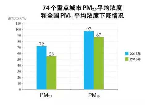 2015年,全國74個(gè)重點(diǎn)城市PM2.5平均濃度為55微克/立方米,相對(duì)于2013年的72微克/立方米下降23.6%;日均值超標(biāo)天數(shù)的比例由2013年的33.2%降至2015年的20.8%。全國PM10平均濃度(338個(gè)城市平均濃度為87微克/立方米),相對(duì)2013年(330個(gè)城市平均濃度97微克/立方米)下降10.3%;日均值超標(biāo)天數(shù)的比例由2013年的14.5%降至2015年的12.1%。74個(gè)重點(diǎn)城市共發(fā)生846天次重度污染和238天次嚴(yán)重污染,較2014和2013年降幅分別為28.1%、24.9%以及49.9%、63.7%。京津冀、長(zhǎng)三角、珠三角和成渝地區(qū)NO2濃度相對(duì)2013年分別下降9.8%、11.9%、19.5%和15.8%,SO2分別下降44.9%、30.0%、38.1%和48.3%。衛(wèi)星資料反演顯示,2013~2015年,全國NO2和SO2垂直柱濃度年均值和顆粒物光學(xué)厚度(AOD)總體呈下降趨勢(shì),與地面監(jiān)測(cè)數(shù)據(jù)分析結(jié)果一致。