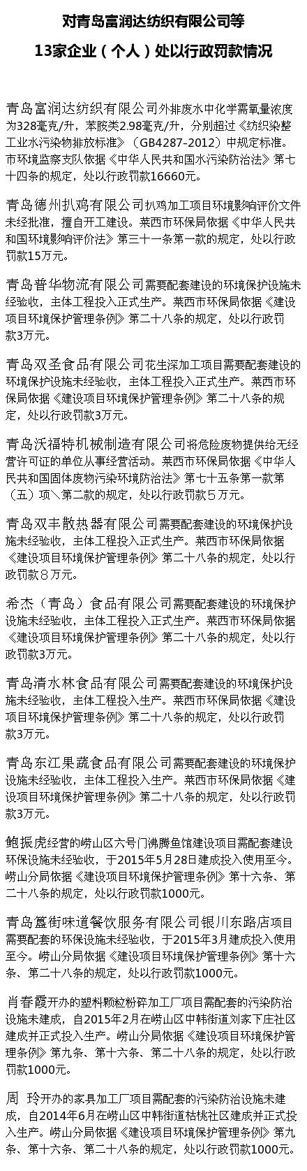 ??????? 9月11日下午,青島市環(huán)保局官方微博公布了對(duì)13家違規(guī)生產(chǎn)企業(yè)(個(gè)人)的處以行政罰款情況,這13家企業(yè)分別是青島富潤(rùn)達(dá)紡織有限公司、青島德州扒雞有限公司、青島普華物流有限公司、青島雙圣食品有限公司、青島沃福特機(jī)械制造有限公司 青島雙豐散熱器有限公司、希杰(青島)食品有限公司、青島清水林食品有限公司、青島東江果蔬食品有限公司、鮑振虎經(jīng)營(yíng)的嶗山區(qū)六號(hào)門沸騰魚館、青島簋街味道餐飲服務(wù)有限公司銀川東路店 肖春霞開辦的塑料顆粒粉碎加工廠 周玲開辦的家具加工廠。