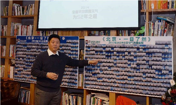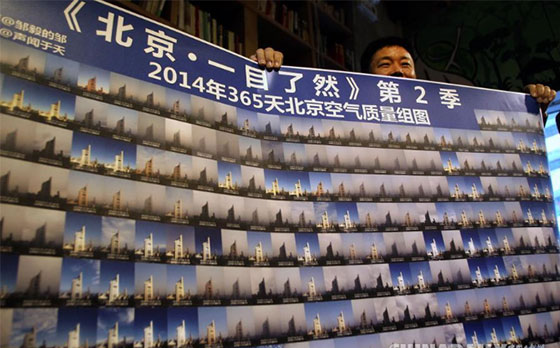 ??????? 這是鄒毅拍攝和拼版的2014年“一目了然”系列照片。鄒毅用2013、2014兩年時(shí)間,在同一地點(diǎn)、同一時(shí)刻用手機(jī)拍攝照片,記錄天氣變化狀況,并將兩年拍攝的700余張照片按年份匯總在一起,希望通過(guò)直觀的影像反映北京空氣質(zhì)量變化,讓更多的人關(guān)注霧霾、關(guān)注環(huán)境保護(hù)。本次分享會(huì)是他首次將兩年的拍攝成果一起集中展示。